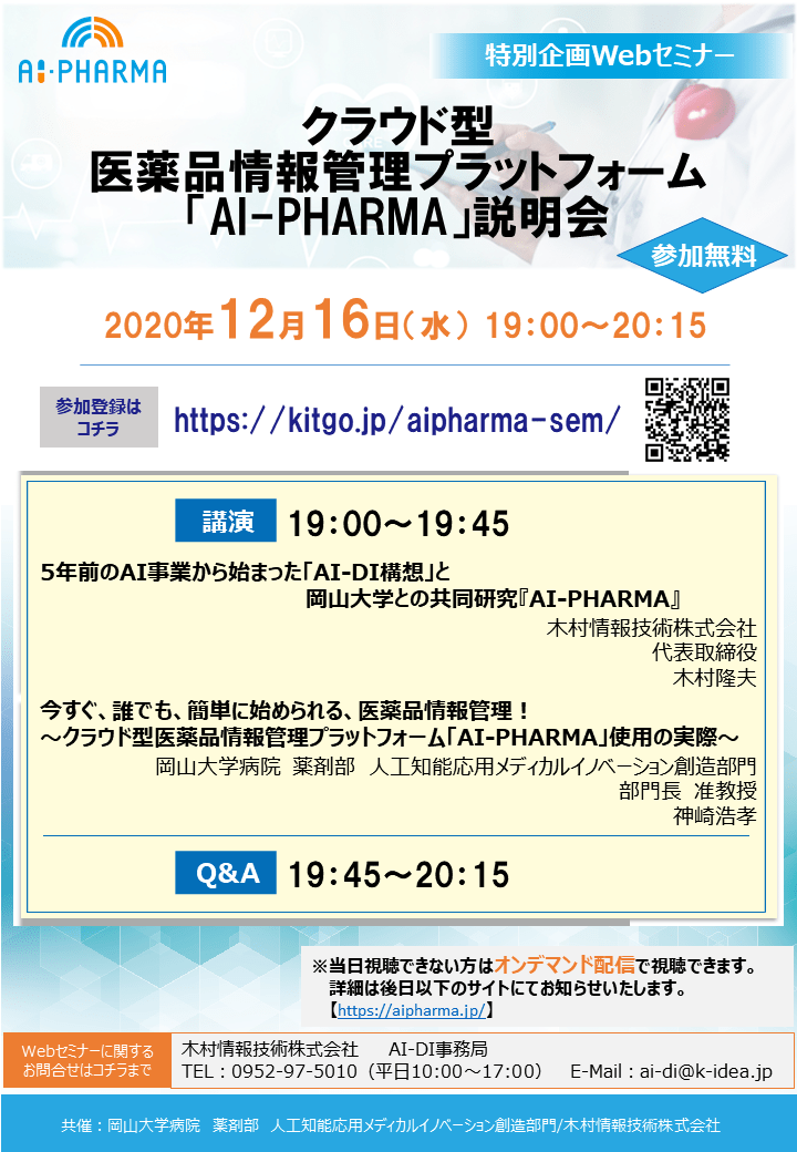 2020年12月16日(水)19:00~20:15に、特別企画Webセミナー[クラウド型医薬品情報管理プラットフォーム「AI-PHARMA」説明会]を開催します。