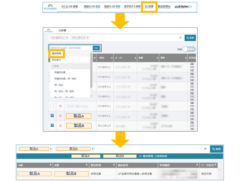 『DI辞書』では全医薬品に対する添付文書・IF・薬価等の医薬品詳細情報検索や相互作用・配合変化・代替薬の一括検索が可能です。