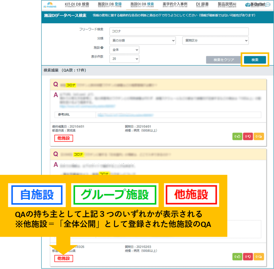 『施設DIデータベース検索』では、単語での検索に対し、「施設内データーベース」および「他施設の全体公開QAデータ」、「KIT-DIデータベース」より該当する回答の一覧が表示されます。