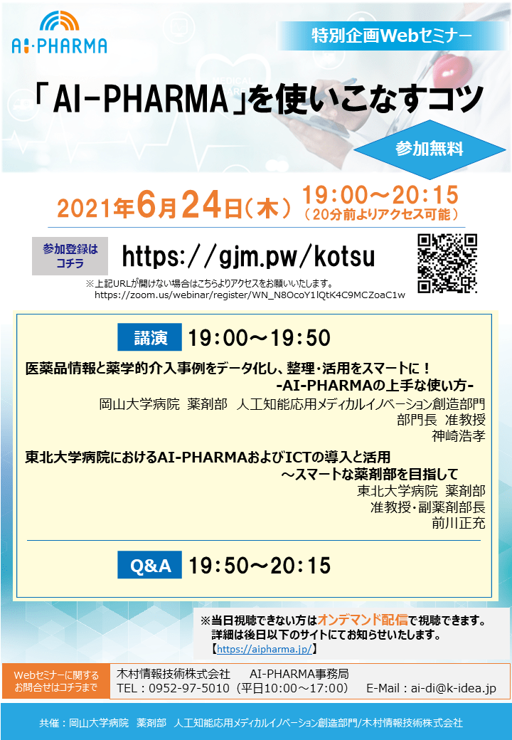 今回のWebセミナーでは医療従事者向けに、クラウド型医薬品情報管理プラットフォーム「AI-PHARMA」を使いこなすコツを岡山県病院薬剤師会や東北大学病院での実際の事例を用いてご紹介します。
