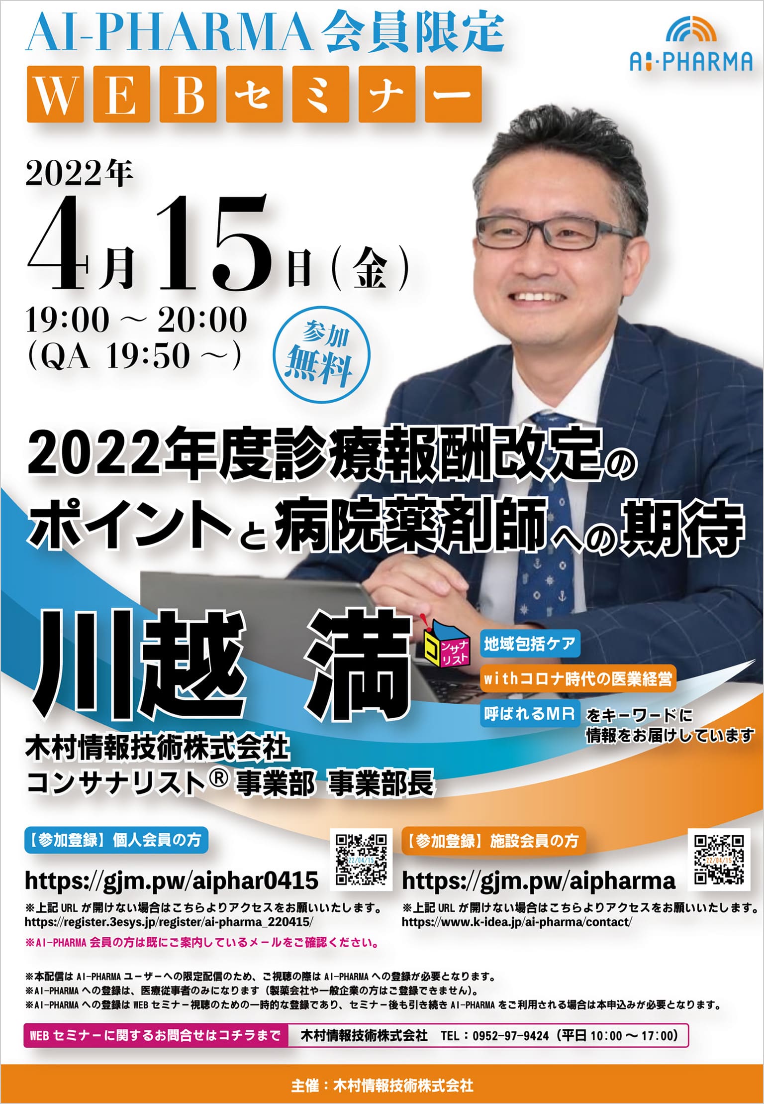 4月15日(金)19:00~20:00に、AI-PHARMA会員限定WEBセミナー「2022年度診療報酬改定のポイントと病院薬剤師への期待」を開催いたします。