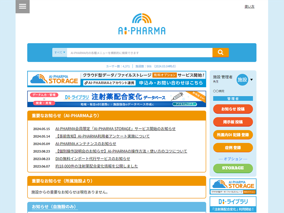- 『AI-PHARMA』とは、木村情報技術が運営する、病院・薬局向けの【無料】データベース構築プラットフォームです。問合せ事例、薬学的介入事例、注射薬配合変化情報などの、薬剤関連情報をデータベース化でき、お知らせ機能による情報配信や、掲示板機能によるユーザー同士の情報共有が可能です。約1,000施設、5,000名近いユーザーにご利用いただいています。(2024年5月15日現在)