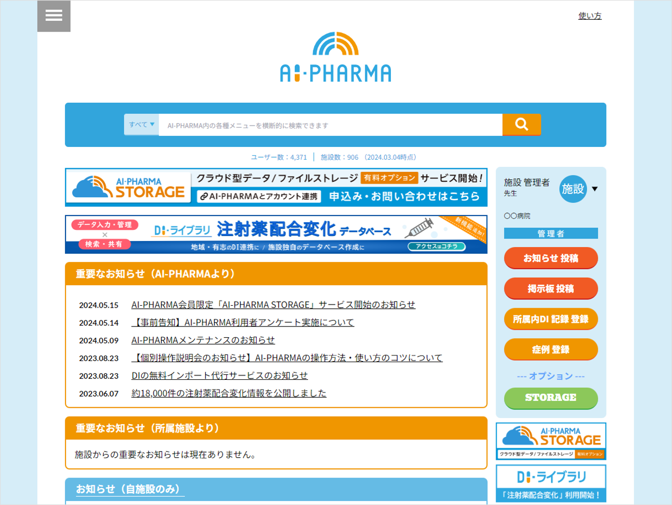 問合せ事例、薬学的介入事例、注射薬配合変化情報などの、薬剤関連情報をデータベース化でき、お知らせ機能による情報配信や、掲示板機能によるユーザー同士の情報共有が可能です。
