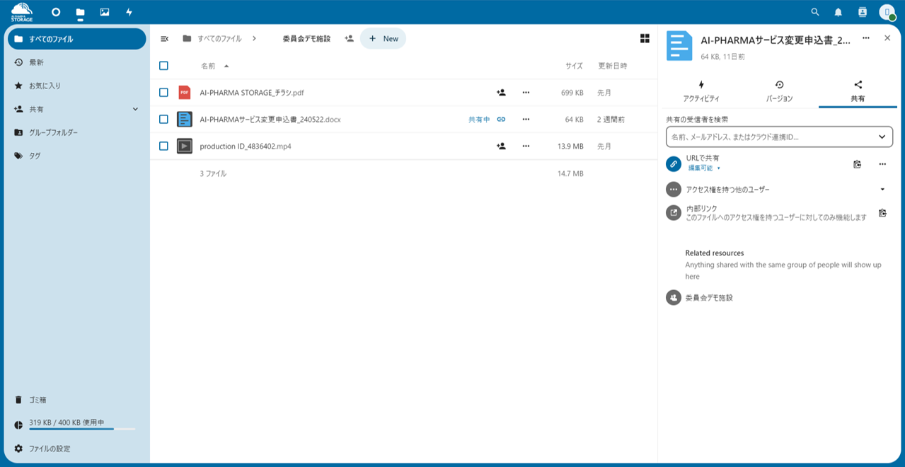 2024年5月にリリースした、医薬品情報管理共有プラットフォーム「AI-PHARMA」のオプションサービスで、デジタルファイルを安全に格納、管理できるクラウド型のファイルストレージです。
